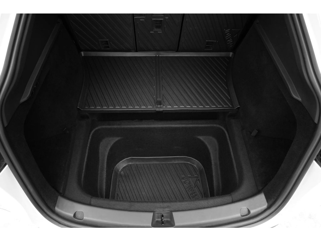 Voděodolná vanička EasyShield a zadní kryty sedadel pro Tesla Model Y (2018–2024 / Juniper 2025+) od Jowua. Maximální ochrana interiéru, +37 litrů úložného prostoru navíc, snadná údržba, přesné lícování, špičkový TPE materiál.